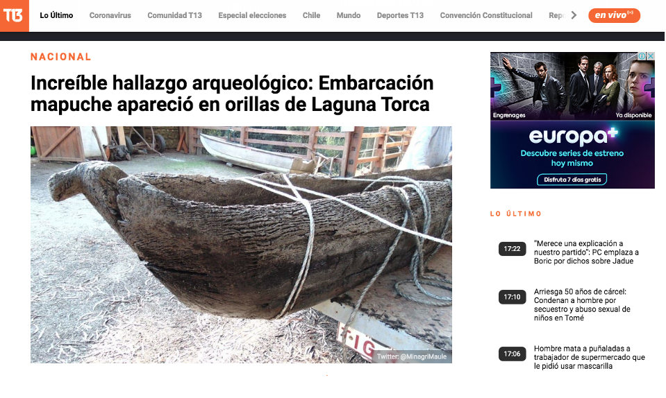 02/13/2021 in PRENSA Increíble hallazgo arqueológico: Embarcación mapuche apareció en orillas de Laguna Torca Por T13 SÁBADO 13, FEBRERO 2021 12:19 HRS https://www.t13.cl/noticia/nacional/hallazgo-arqueologico-embarcacion-mapuche-laguna-torca-13-02-2021 Share Anterior Vichuquén: Sequía permitió hallazgo arqueológico de canoa mapuche en Laguna Torca siguiente 2.2 Seminario de "Eutrofización en Humedales: Medidas de Control y Abordaje a Distinta Escala"